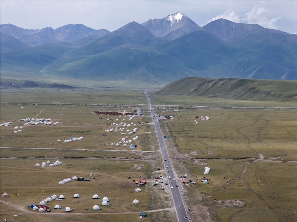 这是7月16日拍摄的新疆独库公路及沿途草原景观(无人机照片)。新华社记者胡虎虎摄