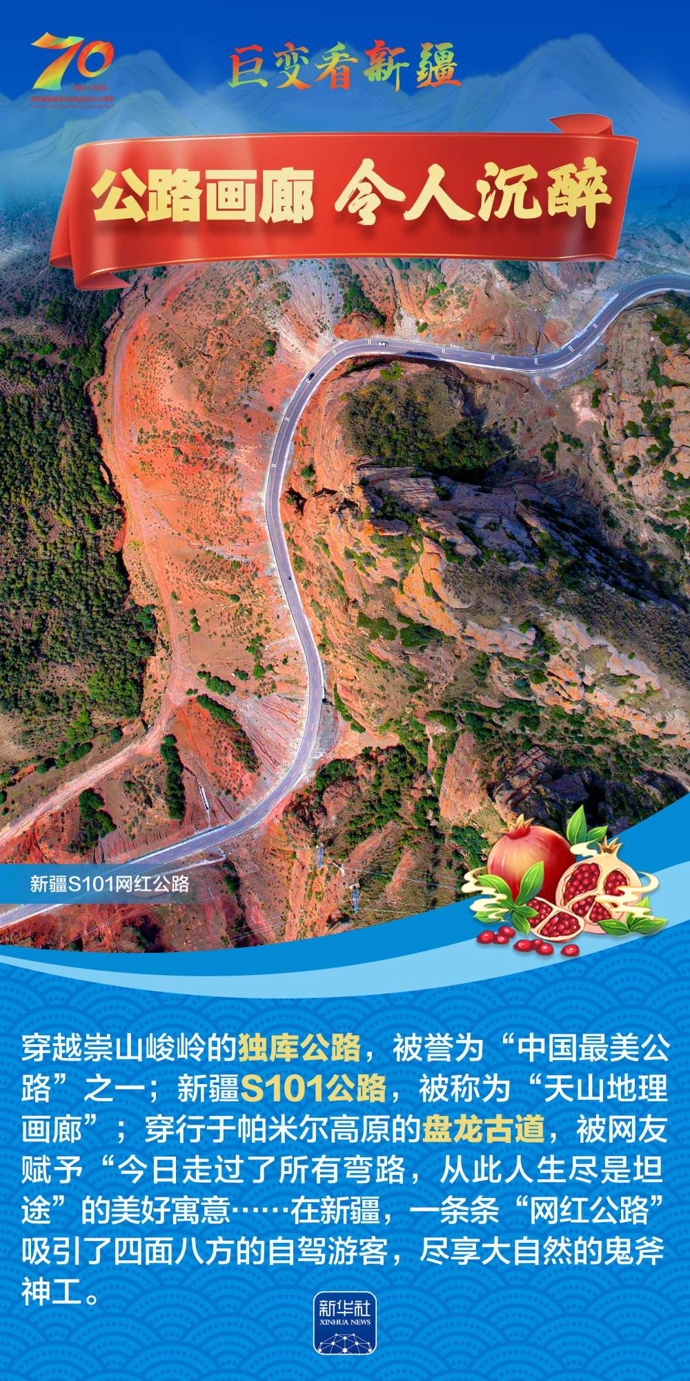 今年是新疆维吾尔自治区成立70周年。70年来,新疆的交通建设日新月异。从驼铃声声、马蹄嘚嘚到铁流纵横、银鹰高翔,一座座交通枢纽辐射四方,一条条“钢铁巨龙”蜿蜒逶迤,一个个支线机场星罗棋布,现代化的新疆立体交通网络日益形成。让我们跟随这组海报,一起见证穿越“三山两盆”、贯通欧亚大陆的新时代新疆交通画卷。