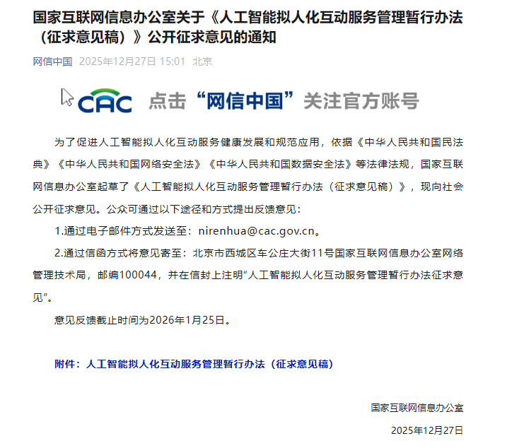 为了促进人工智能拟人化互动服务健康发展和规范应用,依据《中华人民共和国民法典》《中华人民共和国网络安全法》《中华人民共和国数据安全法》等法律法规,国家互联网信息办公室起草了《人工智能拟人化互动服务管理暂行办法(征求意见稿)》,现向社会公开征求意见。公众可通过以下途径和方式提出反馈意见: