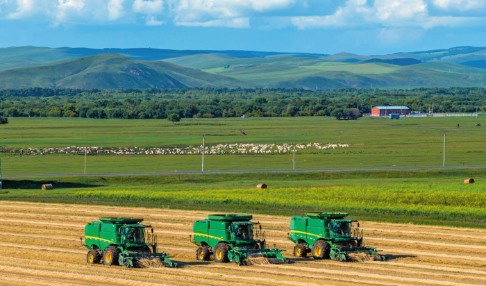 内蒙古呼伦贝尔农垦拉布大林农场的工人驾驶农机收获小麦(2025年8月20日摄)。马金瑞摄/本刊