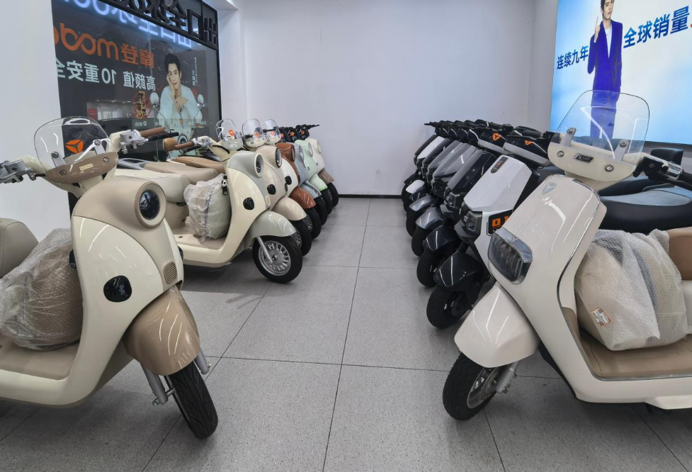 4月9日,福建省福州市平潭县雅迪电动车旗舰店展出的电摩车型。新华网 王岩 摄