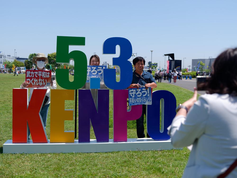 2024年5月3日,在日本东京有明防灾公园,人们举着标语与宪法大集会的标识合影。当日,3万余名日本民众聚集在东京有明防灾公园的广场上,高喊“守护宪法、守护和平”的口号,举行了声势浩大的护宪集会。新华社记者 张笑宇 摄