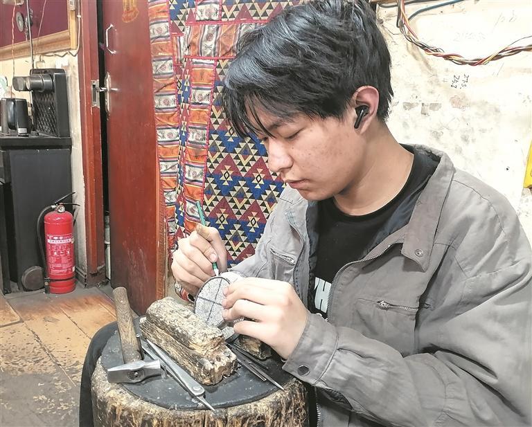 19岁的白族学徒段铁柱神情专注,手中的小铁锤落下时,银底座上的花纹又多了一道。一旁的洪焕锋不时提醒,平面和立体花纹不同,但匠人打磨手工制品的态度是一样的。