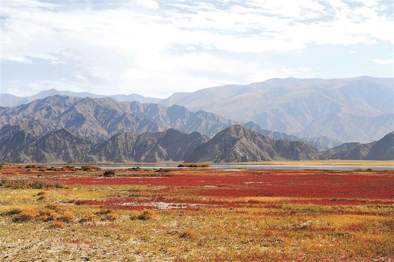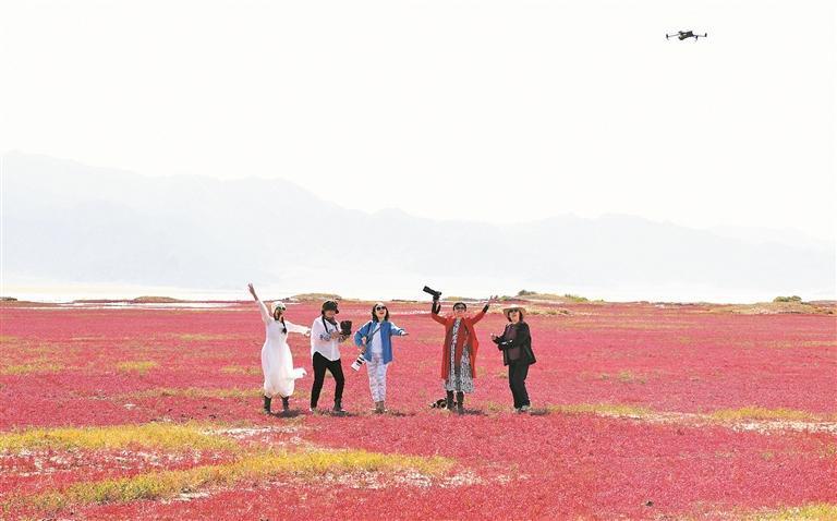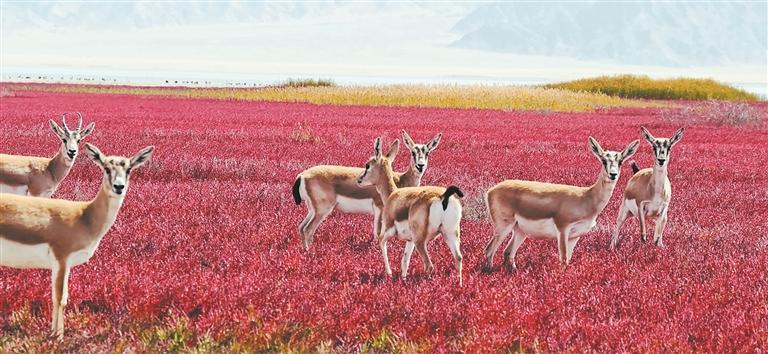 金秋十月,在海西蒙古族藏族自治州乌兰县都兰湖国家湿地公园,湖水波光粼粼,湖岸边的盐爪爪草褪去夏日的青翠,披上浓烈的红妆,宛如一张巨大的“红地毯”延展开来。一群鹅喉羚踏着优雅的步伐,在“红毯”上留下灵动的足迹,其琥珀色的皮毛与红色草甸形成绝妙映衬。这方天地正以最浓烈的色调,绘就青藏高原绚丽的秋日生态长卷。文/青海日报记者 李庆玲