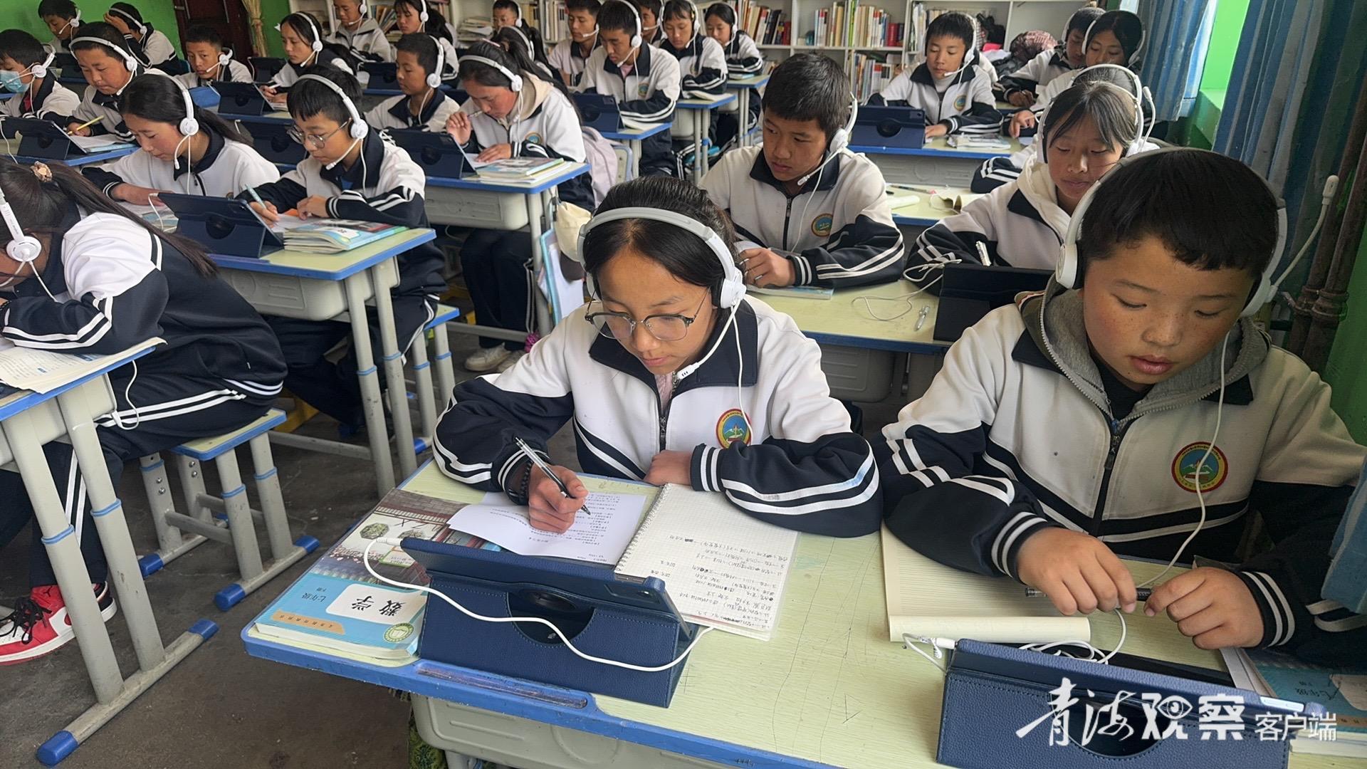 10月12日,黄南藏族自治州尖扎县第二民族中学初二(1)班教室内,每个孩子的课桌上都摆放着iPad。孩子们戴着耳机,紧盯屏幕,专注聆听平板电脑里的名师数学直播课。他们手中的笔不时在笔记本上沙沙游走,逐一记下重点知识。优质教育资源正通过屏幕走进偏远地区的课堂。