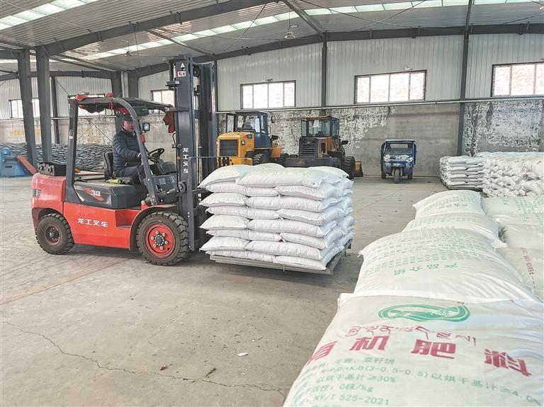 青海天空牧场生物科技有限公司仓库中,工作人员正在装运有机肥。