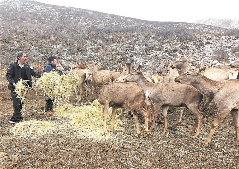 班玛县赛来塘镇合科村养鹿基地负责人谢发成(左)和工友正在为马鹿添加饲草料。记者 祁万强 摄